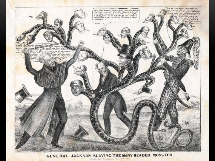 JACKSON VS. THE NATIONAL BANK • Jackson is weary of the national bank • Hard money v. soft money; Constitutionality; Power • National Bank (1816) v. State Banks (Panic 1819) • Congress proposes renewing the bank for 20 years • Clay-Webster political ploy • Bill passes but Jackson vetoes the bill • Jackson destroys the bank (though its charter had not expired) and invests the money in state banks
