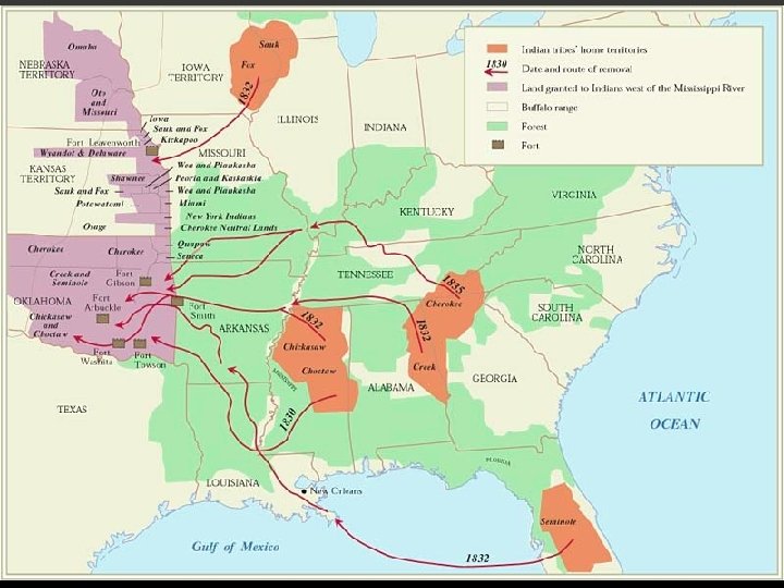 INDIANS FIGHT BACK • The Cherokee, one of the five civilized tribes, fought back in the American way– sues the government • Precedents set by Chief Justice John Marshall • Cherokee Nation v. Georgia, 1831: Tribal Sovereignty • Worcester v. Georgia 1832: GA laws had no force in Cherokee Territory • GA ignores ruling…Federal Court v. State Laws