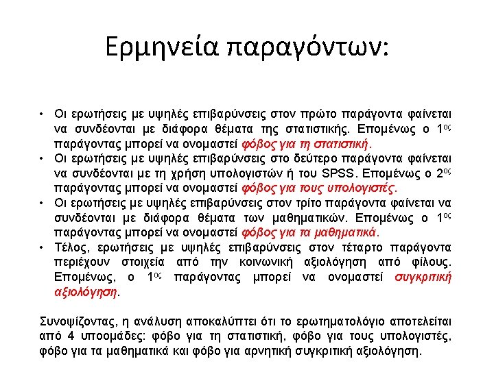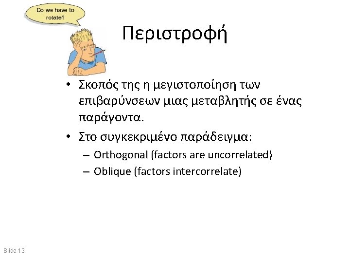 Εύρεση των παραγόντων: Εταιρικότητες • Common Variance: – Variance that a variable shares with other variables. • Unique Variance: – Variance that is unique to a particular variable. • The proportion of common variance in a variable is called the communality. • Communality = 1, All variance shared. • Communality = 0, No variance shared. • 0 < Communality < 1 = Some variance shared. Slide 8