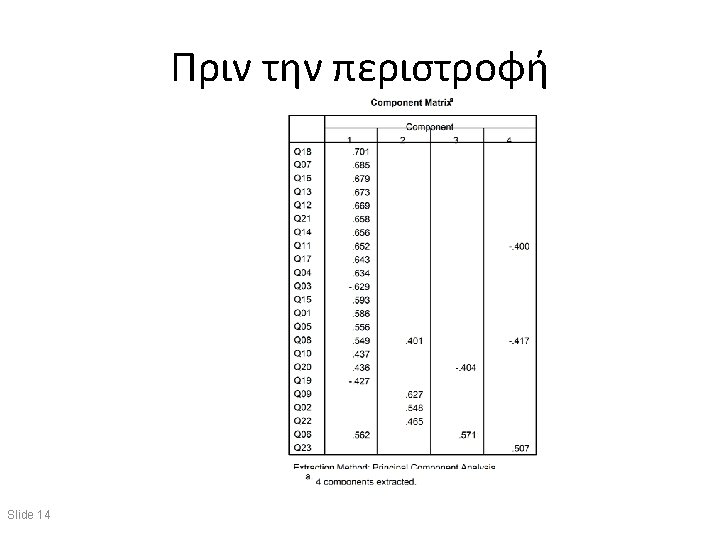 Κριτήρια για την επιλογή των παραγόντων • Kaiser’s Extraction – Kaiser (1960): retain factors with Eigen values > 1. • Scree Plot – Cattell (1966): use ‘point of inflexion’ of the scree plot. • Which Rule? – Use Kaiser’s Extraction when • less than 30 variables, communalities after extraction > 0. 7. • sample size > 250 and mean communality ≥ 0. 6. – Scree plot is good if sample size is > 200. Slide 10