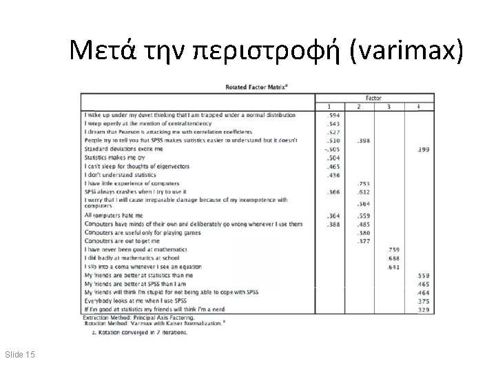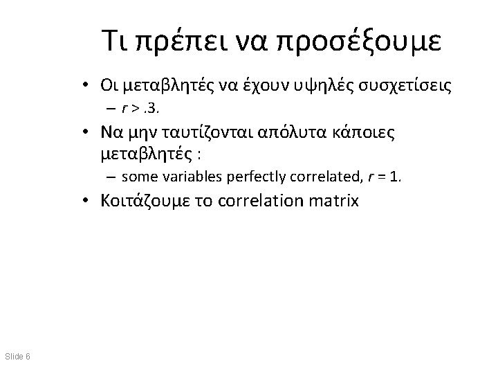 Καταλληλότητα μεταβλητών & δεδομένων • Kaiser-Meyer-Olkin (KMO): – Measures sampling adequacy – should be greater than 0. 5. • Bartlett’s Test of Sphericity: – Tests whether the R-matrix is an identity matrix – should be significant at p <. 05. • Anti-Image Matrix: – Measures of sampling adequacy on diagonal, – Off-diagonal elements should be small. • Reproduced: – Correlation matrix after rotation – most residuals should be < |0. 05| Slide 7