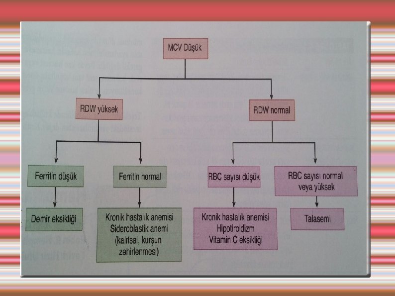 TANI MCV---> RDW---> ortalama kırmızı kan hücre büyüklüğü kırmızı kan hücresi büyüklülük çeşitliliği (retikülositoz) Periferik yayma--->RBC trombosit ve lökosit morfolojileri ve anormal yapılı hücreleri saptama Ferritin ---> Demir eksikliği anemisi ayrımı Direkt Coombs---> hemolitik anemi İndirekt Coombs ---> transfüzyon öncesi uygunluk tarama