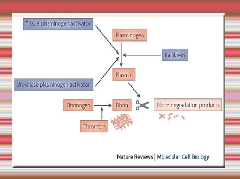 NORMAL PIHTILAŞMA FİBRİNOLİTİK SİSTEM Fibrin pıhtıyı sınırlar Endotel hücrelerinden salınan doku plazminojen aktivatörü(t. PA) ile tetiklenir Fibrin pıhtı içine absorbe olan ve plazminojeni plazmine çeviren yapı t. PAdır Plazmin de fibrinojen ve fibrin monomerleri düşük molekül ağırlıklı parçalara , çapraz bağlı fibrini ise d-Dimere çevirir