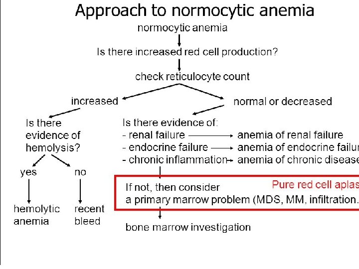 Investigations: - CBC , PBF “ NN RBCs ‘’ , - S. ferritin : high N. - S. iron : N Low. - T. BIC : N Low. - Specific investigation according to the suspected cause , D/D of NNA: - chronic inflammatory diseases( infection, CTD, IBD ) - recent blood loss. - malignancy , marrow infiltration. - chronic renal failure. - marrow aplasia , hypoplasia. - HIV infection. - early nutritional anemia ( iron , B 12 , folate ).