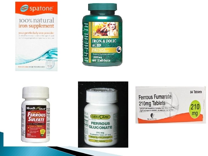 Oral iron ▪ If there is enough time, oral iron is the first line treatment (ferrous salts = elemental iron). ▪ The recommended dose is 120 -240 mg of elemental iron per day ( maximum increase in Hb is 0. 8 g/dl per week ). ▪ Side effects of oral iron are related to the amount of elemental iron contained. There is a 40 % risk of side effects with oral iron preparations, mainly gastrointestinal , and this can have a direct effect on tolerance and compliance. ▪ Vitamin C taken simultaneously aids absoption, hence common advice to take iron with fresh orange juice. ▪ Avoid consuming tea and coffee during or shortly after medication, preferably taken on an empty stomach one hour before meals. Iron should be given two hours before, or four hours after, ingestion of antacids.