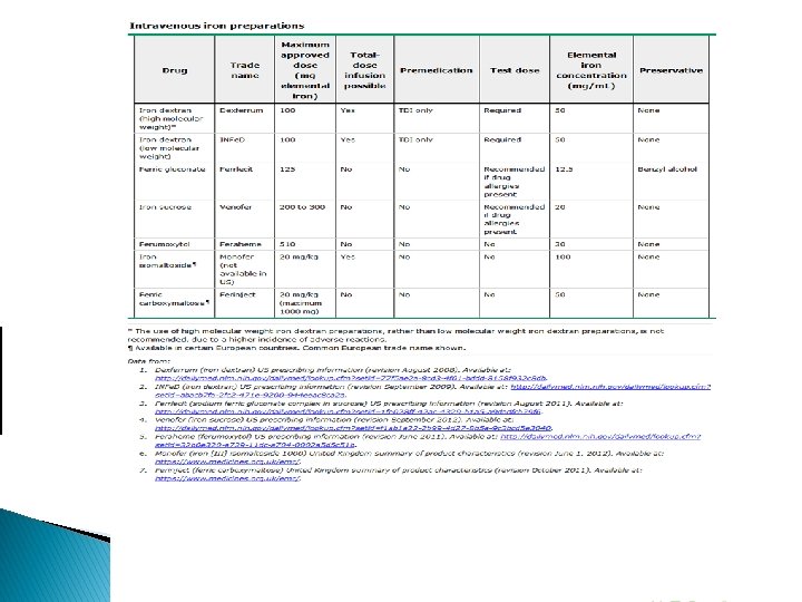 ▪ Choice of preparation : The most appropriate oral iron therapy is use of a tablet containing ferrous salts, such as : ●Ferrous fumarate – 106 mg elemental iron/tablet ●Ferrous sulfate – 65 mg elemental iron/tablet ●Ferrous gluconate – 28 to 36 mg iron/tablet ▪ Follow up : Re-check complete blood picture every 4 weeks. Once the [Hb] is in the normal range, continue oral iron treatment until completion of breastfeeding (with lower dose). Parenteral iron ( IM & IV ) ▪ Indication : For those can not be managed with oral therapy because of lack of compliance, severe gastrointestinal side effects, malabsorption. ▪ Risk of anaphylactic-type reactions. So the recommendation that resuscitation equipment and personnel trained in the detection and treatment of anaphylactic-type reactions be readily available during administration of all parenteral iron preparations.