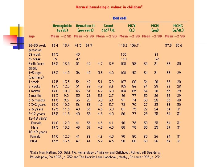 n Anemili bir çocuğun değerlendirilmesi yaşa göre saptanmış Hb ve Hct değerlerine göre yapılmalıdır.