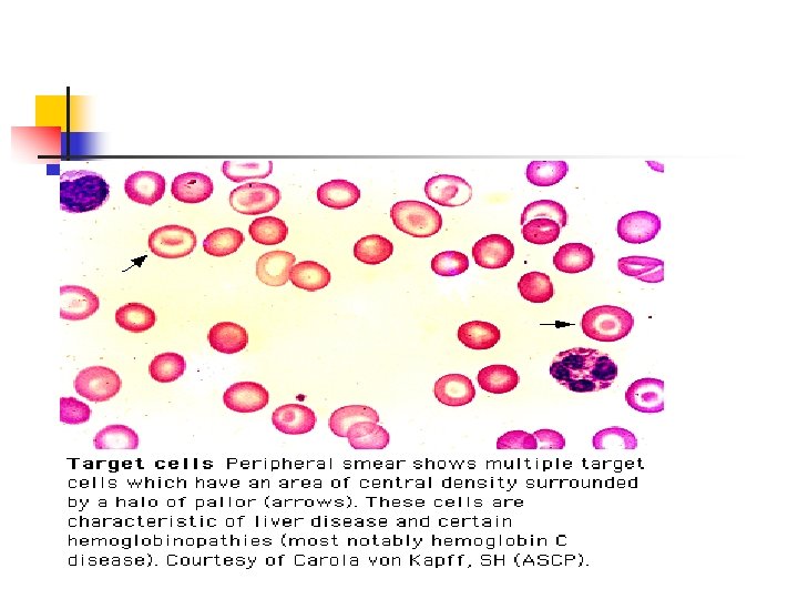 n n RBC targets on a peripheral smear are caused by excessive membrane relative to the amount of hemoglobin. Therefore, target cells are found when the membrane is increased (e. g. , in patients with liver disease) or when the intracellular hemoglobin is diminished (e. g. , in patients with iron deficiency or thalassemia trait). Target cells may also be found in patients with certain hemoglobinopathies (e. g. , hemoglobins C and SC). In these instances, the target cells are caused by aggregation of the abnormal hemoglobin