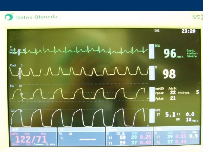 Základní monitorace během anest. subj: Hloubka anestezie, oběh, dýchání, teplota obj: tlak v dýchacích cestách, vydechovaný objem Sp 02 EKG – rytmus, frekvence NIBP kapnometrie, kapnografie teplota Nedostatečné sledování je nejčastější příčinou úmrtí při anestezii.