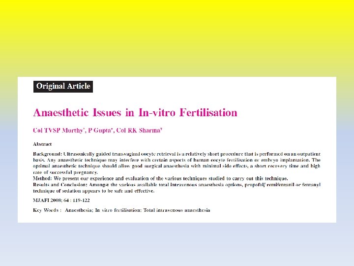 MAC • Monitored anaesthesia technique with remifentanil resulted in a higher pregnancy rate than GA with alfentanil + propofol or isoflurane + propofol for maintenance • Hadimioglo et al had studied various combination of sedation regimens for oocyte retrieval and found no significant difference between midazolam+fentanyl propofol+fentanyl in the recovery characteristic
