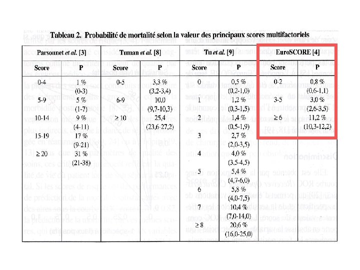 Scores de risque • • • Score de Parsonnet Score de Tuman Euro. SCORE 1 et 2 Score de Higgins CARE score Stratification du risque