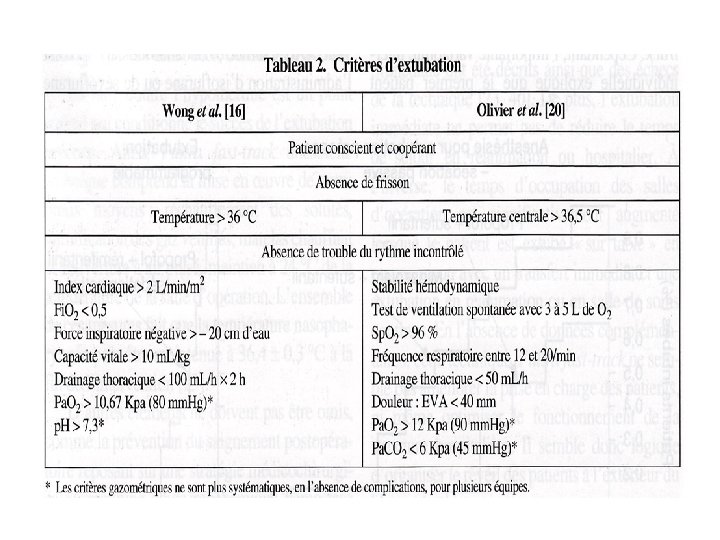 Contrôle des paramètres vitaux • • • Stabilité hémodynamique (PAS > 90 mm. Hg) Saignement médiastinal contrôlé (< 50 m. L/h) Hématose satisfaisante (Pa. O 2/Fi. O 2 > 200 mm. Hg) Diurèse et fonction rénale (> 0, 5 m. L/kg/h) Analgésie efficace (Protocoles douleur)