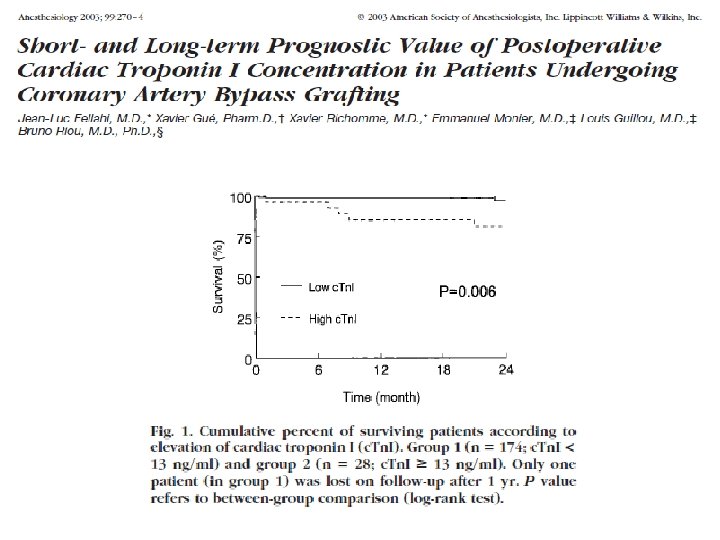 Euro. SCORE et Troponine Ic N = 905 patients de chirurgie cardiaque conventionnelle Mortalité hospitalière 3% (28), MACE 22% (202) Fellahi, Anesthesiology 2011