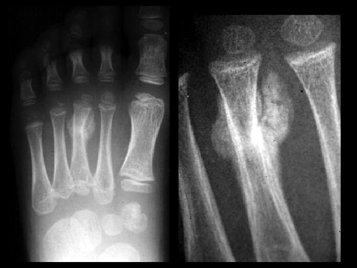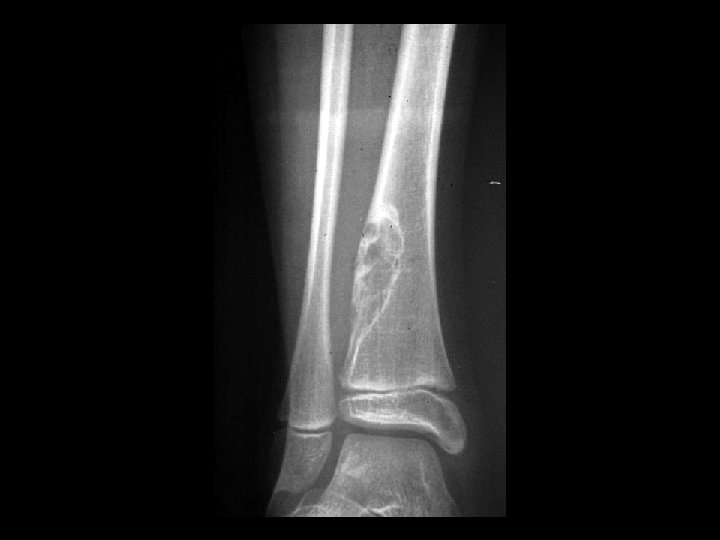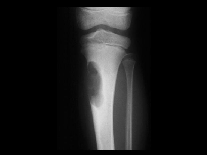 Chondromyxoid fibroma • Findings: – Well-defined eccentric lucent lesion – Cortical thinning – Narrow zone of transition • ddx: – ABC – Infection – Fibrous dysplasia – Giant cell tumor (if physis closed) – Non-ossifying fibroma (if sclerotic margin)