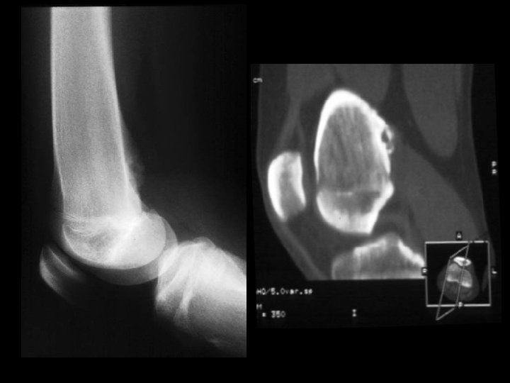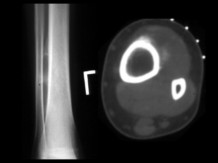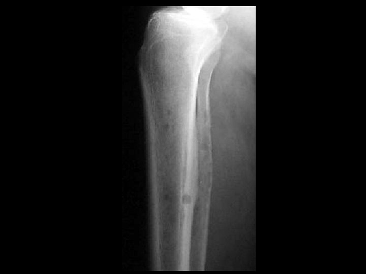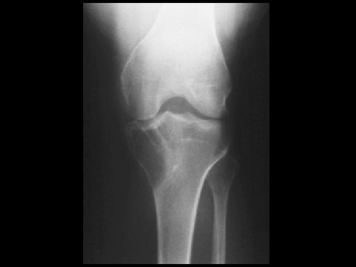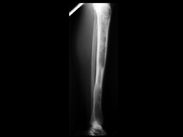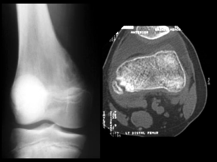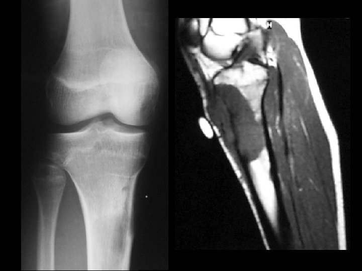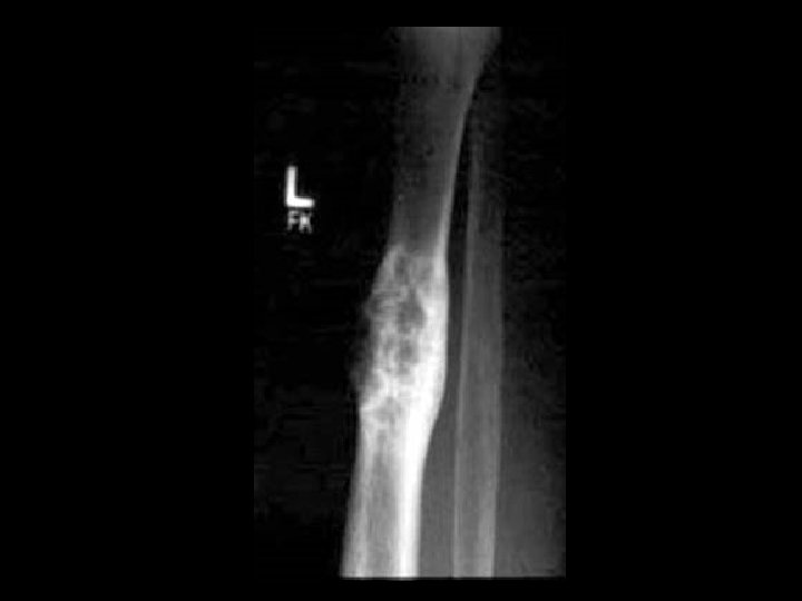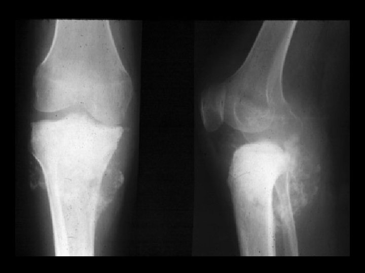 Osteosarcoma • Findings: – lytic lesion of the anterior proximal tibia – cortical breakthrough and a soft tissue mass • ddx: – metastasis – infection – Langerhan’s cell histiocytosis