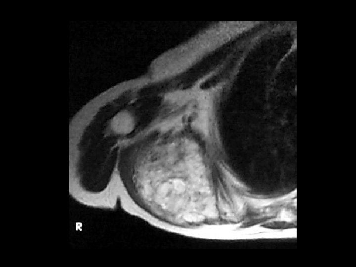 Scapular metastasis • Findings: – Soft tissue mass of the right shoulder with destruction of the adjacent scapula • ddx: – Soft tissue sarcoma