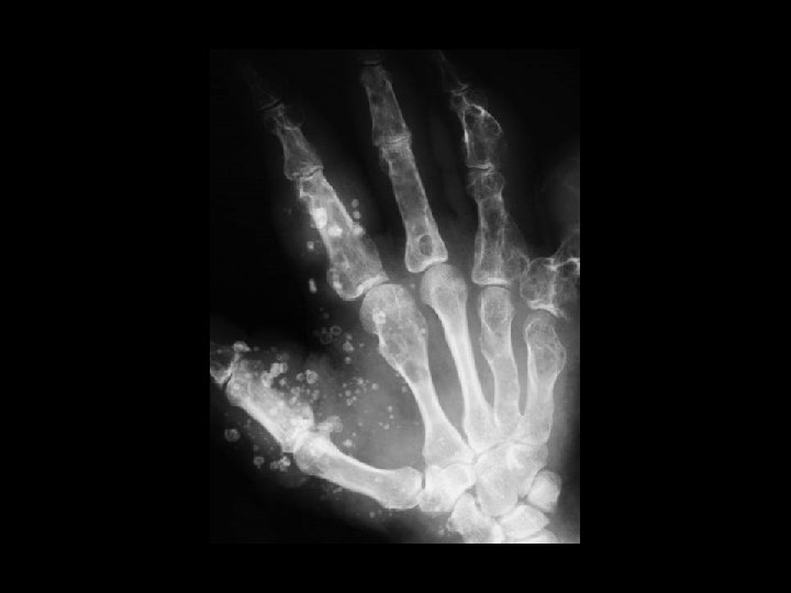 Synovial osteochondromatosis • Findings: – Multiple round calcified masses in the joint space – Erosions on both sides of the joint – Single joint involvement • ddx: – Primary (idiopathic) – Secondary to OA