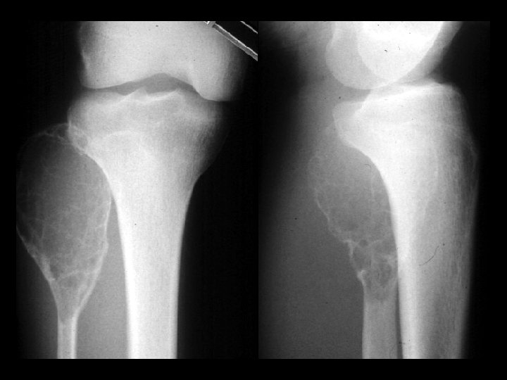 Hemangioma • Findings: – expansile lesion of the proximal tibia containing fine bony septations and a large course calcification – CT scan shows a lacey appearance • ddx: – Paget’s dz – ABC