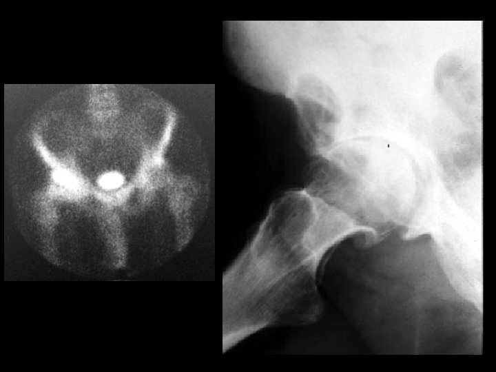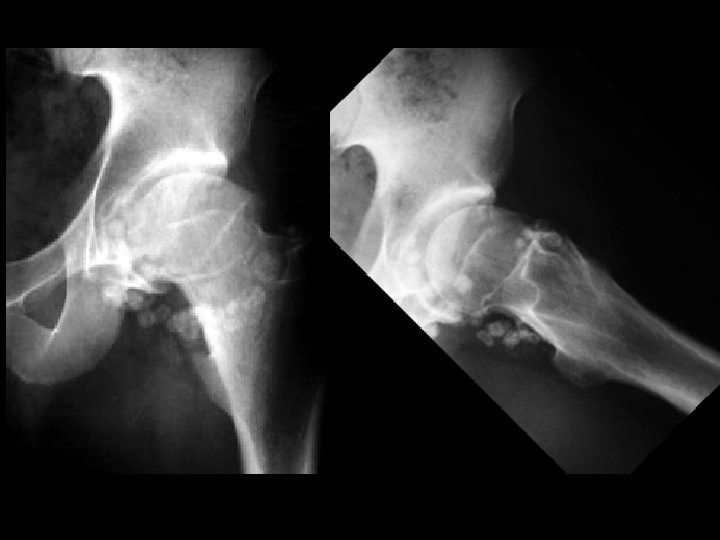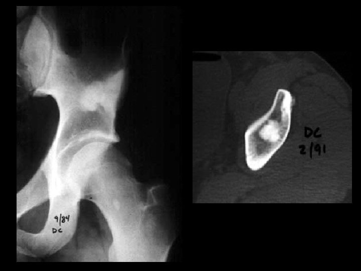 Severe OA & Geode • Findings: – severe osteoarthritis of the right hip – lytic lesion in the adjacent superior acetabulum – hot on bone scan • ddx: – fibrous dysplasia – ABC – infection – erosion