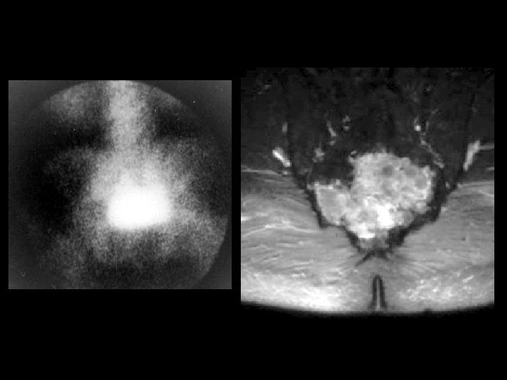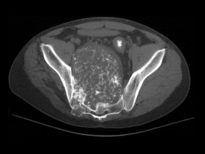 Chordoma • Findings: – Large destruction lesion in the deep pelvis – high T 2 signal – hot on bone scan • ddx: – chondrosarcoma – teratoma – metastasis