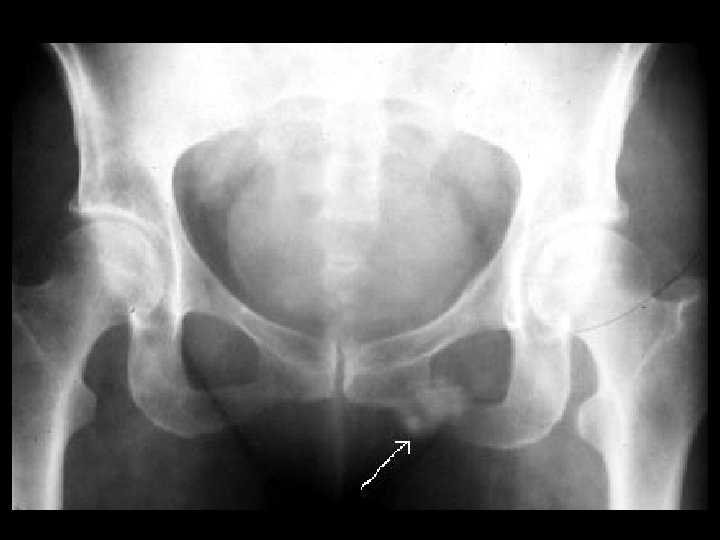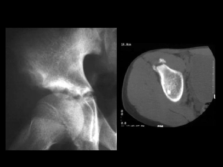 Avulsion injury • Findings: – Soft tissue calcification along the superior anterior acetabulum – No cortical involvement – Normal joint space • ddx: – Myositis ossificans – Parosteal osteosarcoma