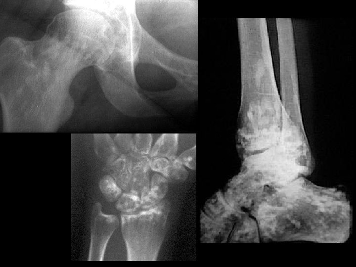 Gaucher’s disease • Findings: – Flask-shaped long bones = undertubulation – Varied appearance includes multiple lucent lesions and bone infarcts • ddx: – other glycogen storage dz