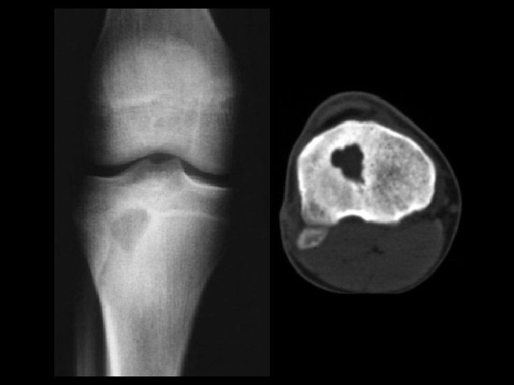 Non-ossifying fibroma • Findings: – Well-defined lucent cortical lesion – Sclerotic margin – No periosteal reaction or soft tissue mass • ddx: – Fibrous dysplasia – Langerhan’s cell histiocytosis – ABC