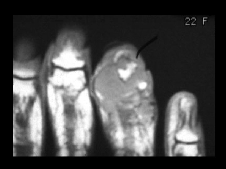 Giant cell tumor • Findings: – soft tissue mass destroying the tuft • ddx: – osteomyelitis – metastasis – chondrosarcoma