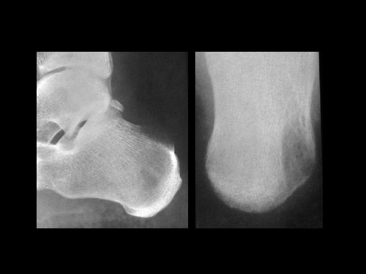 Calcaneal Ewing’s sarcoma • Findings: – Permeative lesion in the calcaneous – Cortical disruption and slight periosteal reaction • ddx: – Lymphoma – Metastasis/myeloma – Infection – Langerhan’s cell histiocytosis