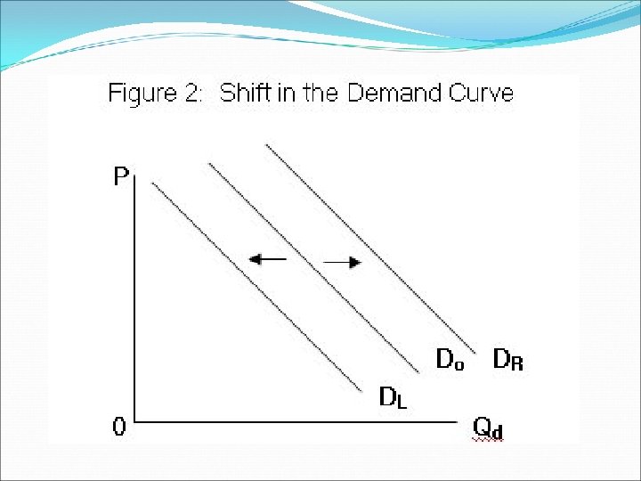Kung maraming tao ang mamimili sa pamilihan, mas maraming kurba ng demand ang dapat idagdag, at ang kurba ng demand ay lilipat (shift) pakanan. Ang kurba ng market demand ay maaari ding lumipat bunga ng pagbabago ng… Panlasa (taste) Pagbabago sa kita Pagbabago sa dami ng mamimili