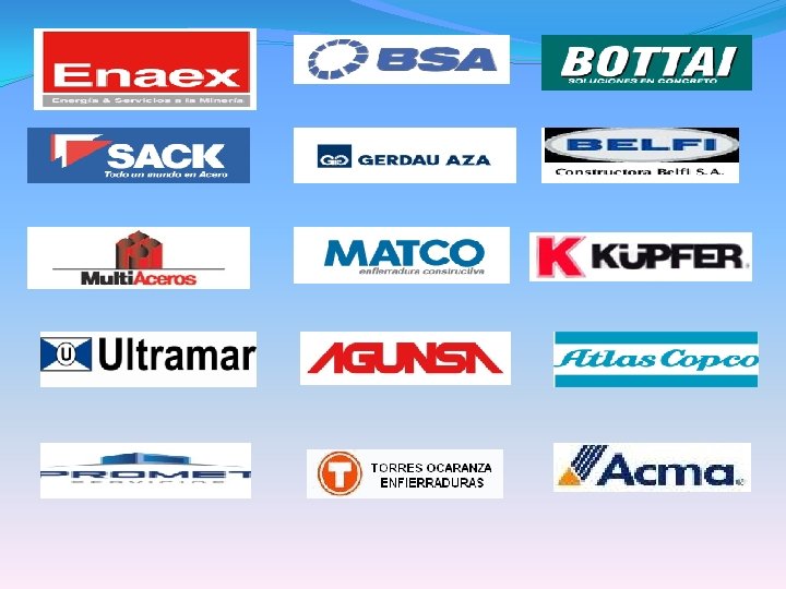 Nuestros Clientes En el correr de los años, nuestra cartera de clientes se ha extendido de forma considerable, ubicándose en el ámbito portuario, construcción y principalmente minero, donde podemos encontrar algunos tales como.