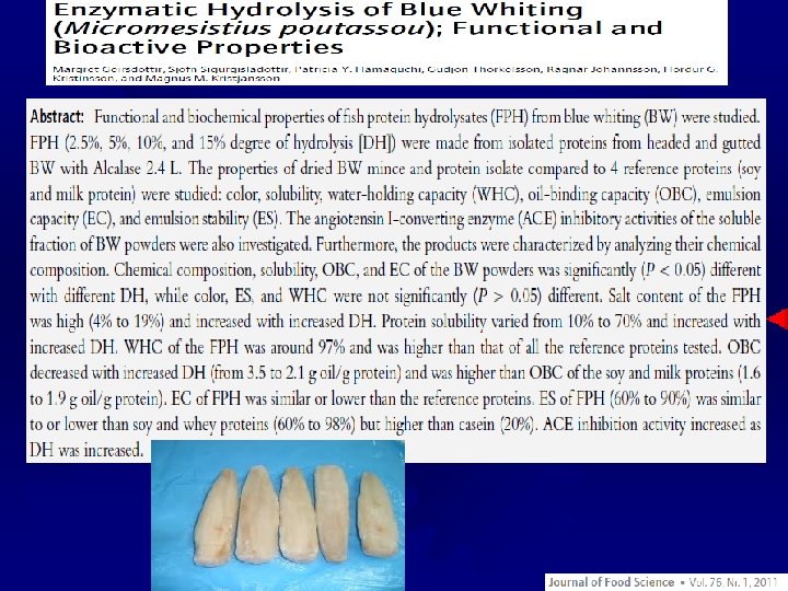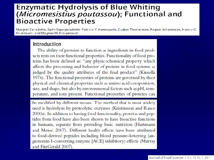 2. Structure Formation (protein interactions) ® Gels – a 3 -D network of protein and water. ® Attractive and repulsive forces between adjacent polypeptides ® Gelation- when denatured proteins aggregate and form an ordered protein matrix ® Water absorption and thickening ® Formation of viscous, solid, or visco-elastic gels ® For many proteins, heated followed by cooling forms the gel ® Texturization – Proteins are responsible for the structure and texture of many foods ® Meat, bread dough, gelatin ® Texturized proteins are modified with salts, acid/alkali, oxidants/reductants ® ® “Pink Slime” Can also be processed to mimic other proteins (i. e. surimi)
