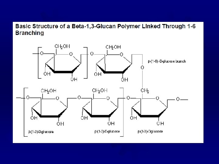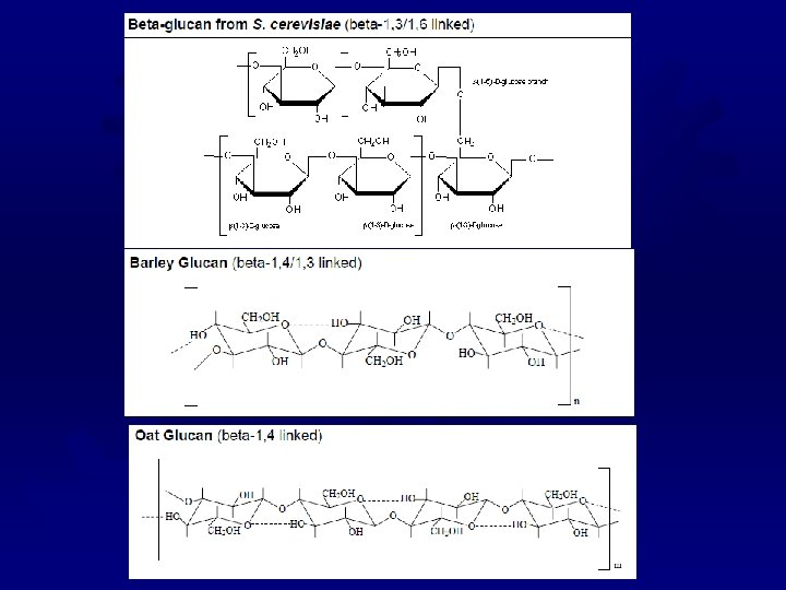 BETA-GLUCANS ® Extracts from the bran of barley and oats ® Long glucose chains with mixed ß-linkages ® Very large (~250, 000 glucose units) ® Water soluble, but have a low viscosity ® Can be used as a fat replacer ® Responsible for the health claims (cholesterol) for whole oat products ® Formulated to reduce the glycemic index of a food