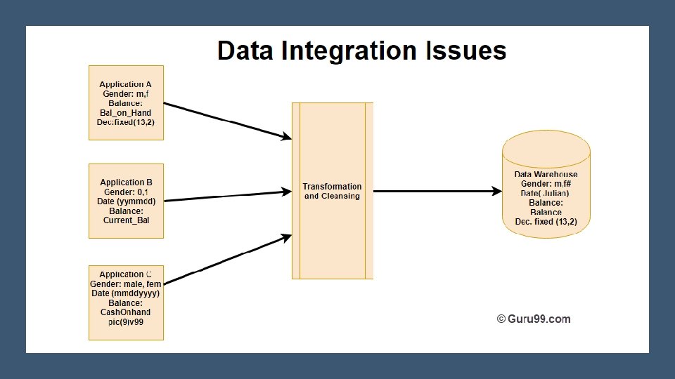 Typical issues of data sources • Incompatible data values - duplicated data have different values • Different data formats - dates or currency data can be stored in different formats • Incorrect data values • Synonyms and homonyms - words that are also written and pronounced, and have different meanings need to be renamed • Built-in process logic - eg, "00" value - the shipment was returned, "FF" the shipment was forwarded at the end of the month.