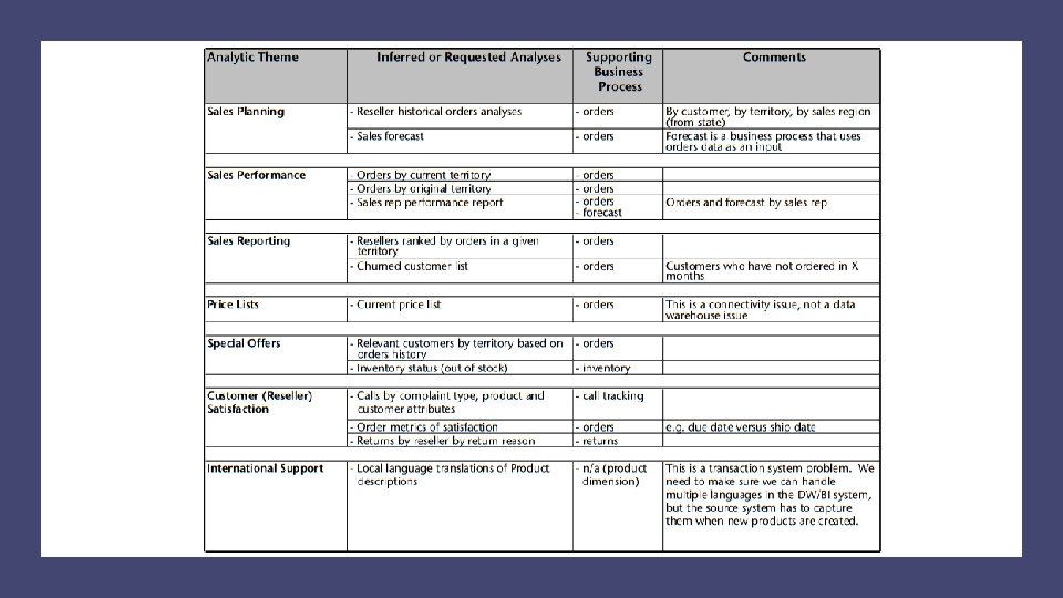 3. Analytic Themes and Business Processes • Group similar requirements into common analytic themes. – For example, Sales Planning is an analytic theme that is supported by information from the orders business process. • Most of the following requirements could be met with data from the orders business process: – – – – – Sales planning input Basic sales reporting Special offers Production forecast input Product planning and monitoring Internet customer demographics (with a well-designed customer dimension) Customer profiling Customer loyalty program Standardized currency reporting