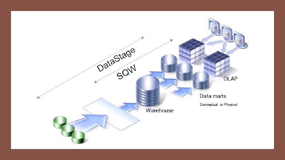 Tiers Information Sources Data Warehouse Server (Tier 1) OLAP Servers (Tier 2) Clients (Tier 3) e. g. , MOLAP Semistructured Sources Data Warehouse extract transform load refresh etc. Analysis serve Query/Reporting serve e. g. , ROLAP Operational DB’s serve Data Marts Data Mining