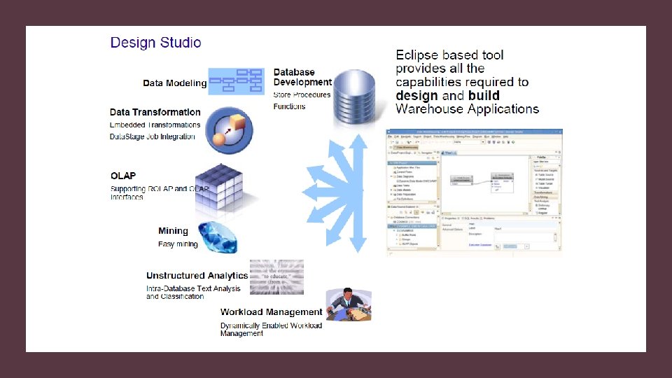 Info. Sphere Warehouse Foundation Technologies • SQL Warehousing (SQW) Tool & Integration with Data. Stage – The SQL Warehousing Tool provides Data Movement and Transformation capabilities based on and optimized for the DB 2 engine. – Transformations and Data Movement jobs are developed in a fully integrated graphical interface within the Design studio. • Data. Stage is an Enterprise ETL that allows integration of data across multiple systems and processing high volume of data. – – – Data. Stage increases the ETL capability of SQW Allows a more deeper analysis of data Extracts from a wider range of data sources (Oracle, SAP, People. Soft, …) into the ISW System. Provides cleansing and advanced ETL Data. Stage works in Tandem with SQW