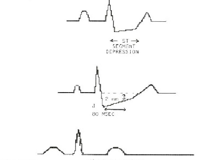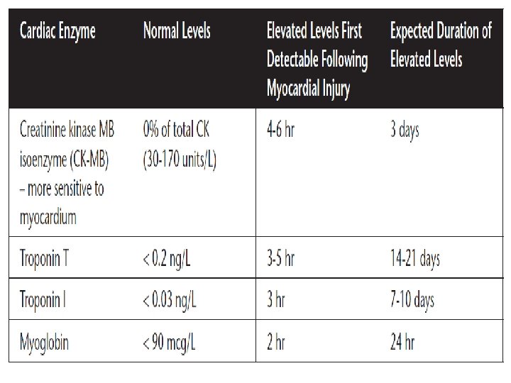 Diagnostic Procedures and Nursing Interventions ECG: Check for changes on serial ECGs. Angina: ST depression and/or T-wave inversion (ischemia) � MI: T-wave inversion (ischemia), ST-segment elevation (injury), and an abnormal Q wave (necrosis) � Clients with non-ST elevation MIs have other indicators. ST segment depression that resolves with relief of chest pain � New development of left bundle branch block � T-wave inversion in all chest leads � Serial Cardiac Enzymes: Typical pattern of elevation and decrease back to baseline occurs with MI. Cardiac catheterization reveals the exact location of coronary artery obstructions and the degree of ischemia and necrosis.