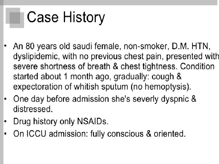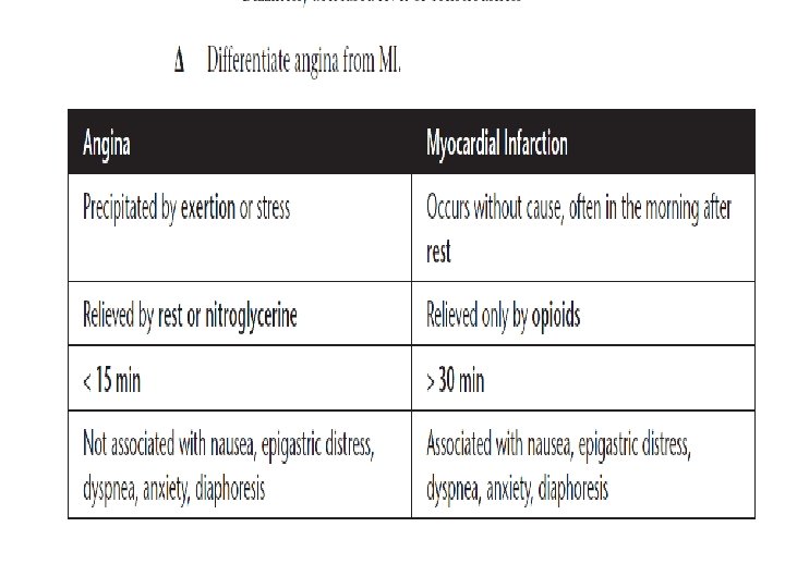 Complications and Nursing Implications Acute MI is a complication of angina not relieved by rest or nitroglycerin. Cardiogenic shock is a serious complication of pump failure, commonly following an MI of 40% or more of the left ventricle. It is Class IV heart failure (tachycardia, hypotension , inadequate urinary output (less than 30 m. L/hr), altered level of consciousness, respiratory distress (crackles, tachypnea), cool, clammy skin, decreased peripheral pulses, and chest pain. Intervention: O 2, ET, morphine IV and/or nitroglycerin , vasopressors IV and/or positive inotropes Other possible emergency interventions include use of an intraaortic balloon pump and/or emergency CABG Ischemic mitral regurgitation due to myocardial ischemia may be evidenced by the development of new cardiac murmur. Dysrhythmias due to myocardial hypoperfusion require vigilant continuous cardiac monitoring. Ventricular aneurysms/rupture due to myocardial necrosis may present as sudden chest pain, dysrhythmias, and severe hypotension.