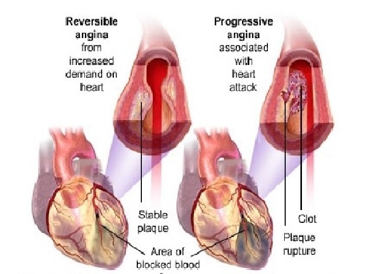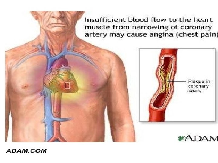Risk Factors for Angina and MI Male gender Hypertension Smoking history Increased age Hyperlipidemia Metabolic disorders: Diabetes mellitus, hyperthyroidism Methamphetamine or cocaine use Stress: Occupational, physical exercise, sexual activity Obesity Lack of exercise Hx of cardiac disease