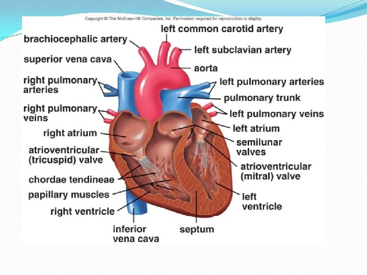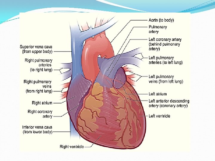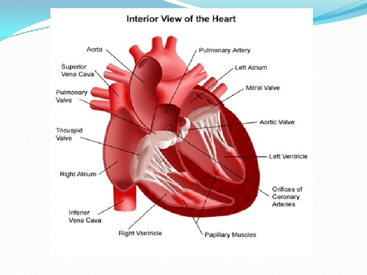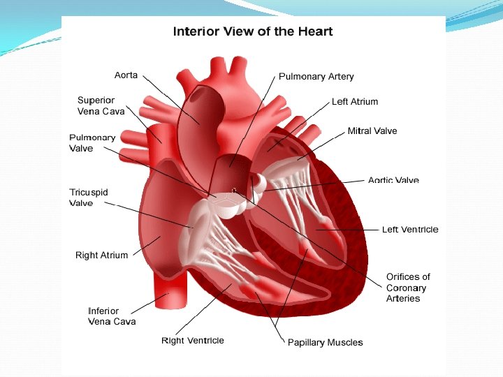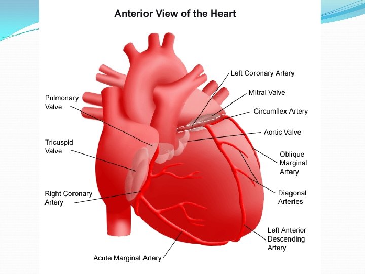 1. Right Coronary 2. Left Anterior Descending 3. Left Circumflex 4. Superior Vena Cava 5. Inferior Vena Cava 6. Aorta 7. Pulmonary Artery 8. Pulmonary Vein 1. Right Atrium 2. Right Ventricle 3. Left Atrium 4. Left Ventricle 5. Papillary Muscles 6. Chordae Tendineae 7. Tricuspid Valve 8. Mitral Valve 9. Pulmonary Valve Aortic Valve (Not pictured)