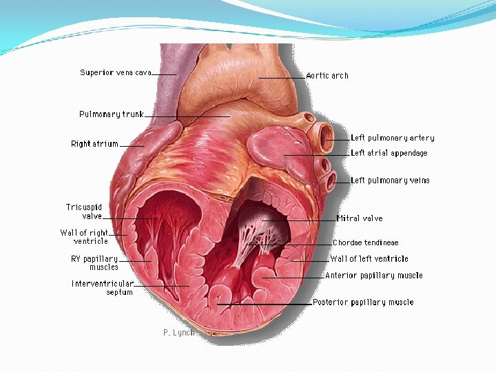 The right ventricle: . It form the cranial border of the heart. 1 -It receives deoxygenated blood from the right atrium by right atrioventricular orifice that guarded by the tricuspid valve, and pumps it into the pulmonary trunk by the pulmonary opening that guarded by the pulmonary valve. Pulmonary trunk : is branches into the pulmonary arterial system which transporting deoxygenated blood from the right ventricle to the lungs 2 -It is triangular in form, and extends from the right atrium to near the apex of the heart. 3 -The wall of the right ventricle is thinner than that of the left, the proportion between them being as 1 to 3; it is thickest at the base, and gradually becomes thinner toward the apex. The of right ventricle cavity equals in size that of the left ventricle. 4 -The upper left corner of the right ventricle, is called the infundibulum or conus arteriosus, is a conical pouch at the entrance of pulmonary trunk. 5 - all wall of the ventricular bear muscular ridge and bands termed the trabeculae carneae, except in the conus arteriosus is smooth