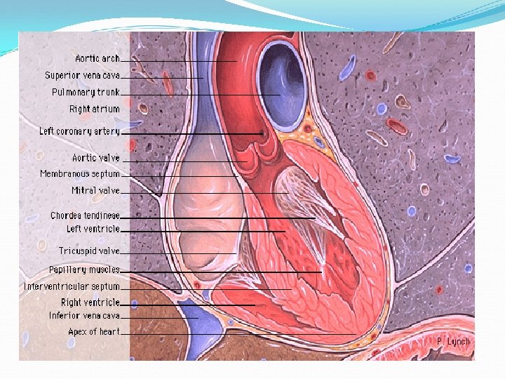 The heart: is conical, hollow, muscular organ constructed of a special kind of muscle called myocardium or cardiac muscle. it is enclosed in the pericardium and located in thoracic cavity between right and left lung in the middle of the mediastinum, opposite to the lateral wall of the thoracic wall from the 2 nd or 3 rd intercostal space to the 6 th rib or to 5 th rib in the (horse and dog) and ruminant respectively. it is attached at the base of the heart with large vessels, but in internally free in pericardium The wall of the heart consists of three layers from external to internal: 1 -the epicardium 2 -the myocardium: it is peculiar striated muscles. 3 -the endocardium: it is thin layer which lines the heart cavity. Morphology of the heart : Athe heart divided into two cavities: 1 left cavity pumps blood throughout the body. 2 right cavity pumps blood only through the lungs. Each cavity is in turn divided into two chambers, the upper ones called atria, the lower ones ventricles