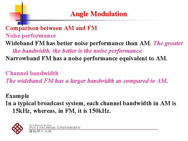 Angle Modulation Comparison between AM and FM Noise performance Wideband FM has better noise performance than AM. The greater the bandwidth, the better is the noise performance. Narrowband FM has a noise performance equivalent to AM. Channel bandwidth The wideband FM has a larger bandwidth as compared to AM. Example In a typical broadcast system, each channel bandwidth in AM is 15 k. Hz, whereas, in FM, it is 150 k. Hz.