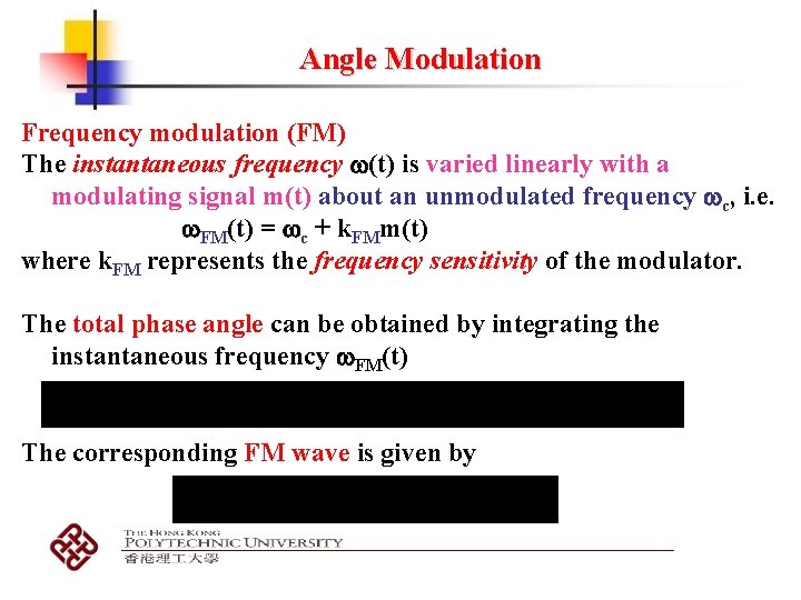 Angle Modulation Frequency modulation (FM) The instantaneous frequency (t) is varied linearly with a modulating signal m(t) about an unmodulated frequency c, i. e. FM(t) = c + k. FMm(t) where k. FM represents the frequency sensitivity of the modulator. The total phase angle can be obtained by integrating the instantaneous frequency FM(t) The corresponding FM wave is given by