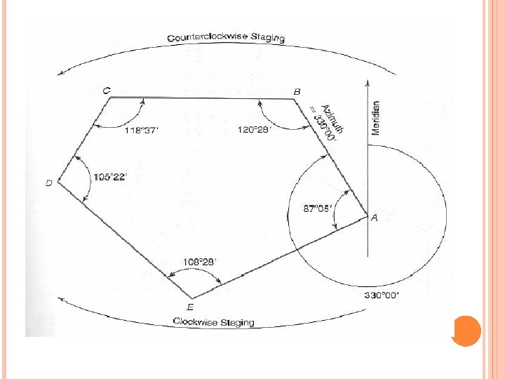 AZIMUTH COMPUTATION When computations are to proceed around the traverse in a clockwise direction, subtract the interior angle from the back azimuth of the previous course. When computations are to proceed around the traverse in a counter-clockwise direction, add the interior angle to the back azimuth of the previous course.