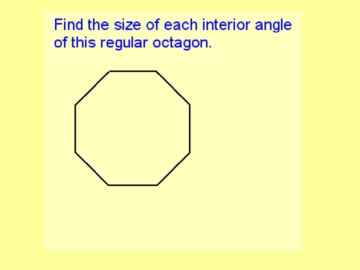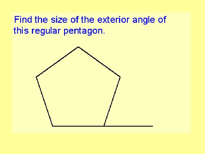 exterior angle = 360° ÷ number of sides of shape Interior angle = 180 ° - exterior angle