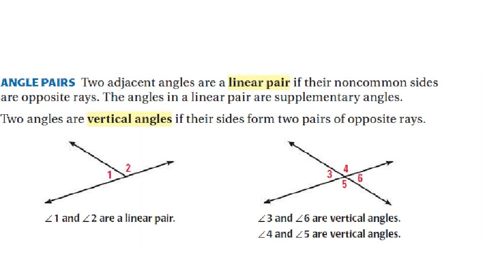 Complementary = Right Angle Supplementary = Straight Angle (line) • Adjacent angles are two angles that share a common vertex and side, but have no common interior points.