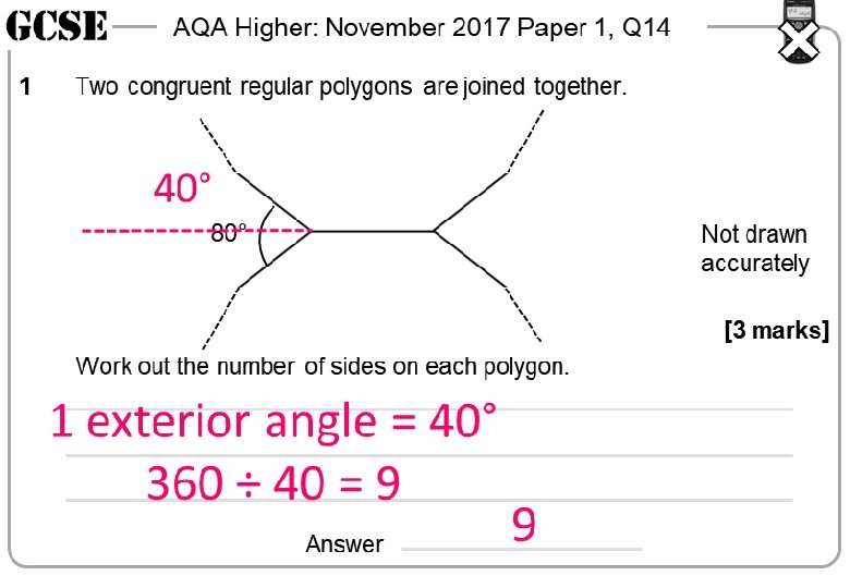 AQA Higher: November 2017 Paper 1, Q 14 1 AQA Higher: November 2017 Paper 1, Q 14 Two congruent regular polygons are joined together. 80° 1 Two congruent regular polygons are joined together. 80° Not drawn accurately [3 marks] Work out the number of sides on each polygon. Answer AQA Higher: November 2017 Paper 1, Q 14 1 AQA Higher: November 2017 Paper 1, Q 14 Two congruent regular polygons are joined together. 80° 1 Not drawn accurately Two congruent regular polygons are joined together. 80° Not drawn accurately [3 marks] Work out the number of sides on each polygon. Answer