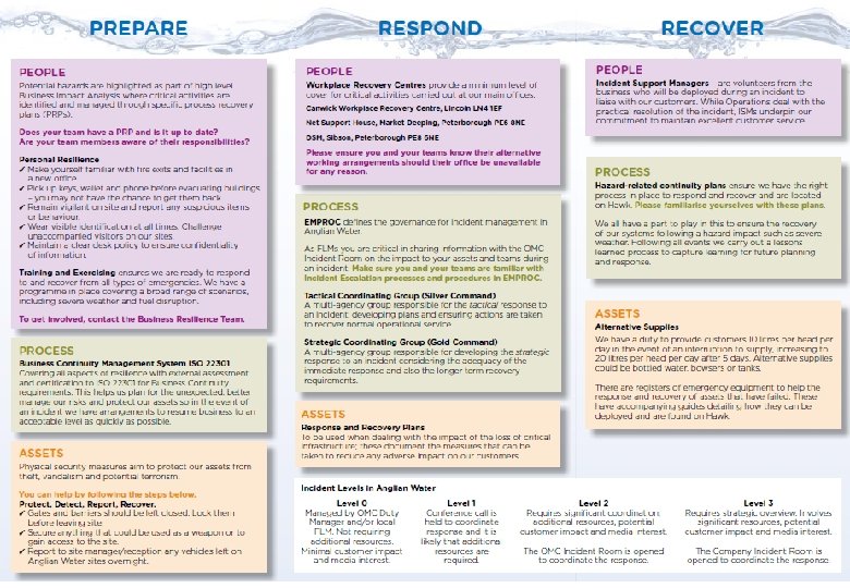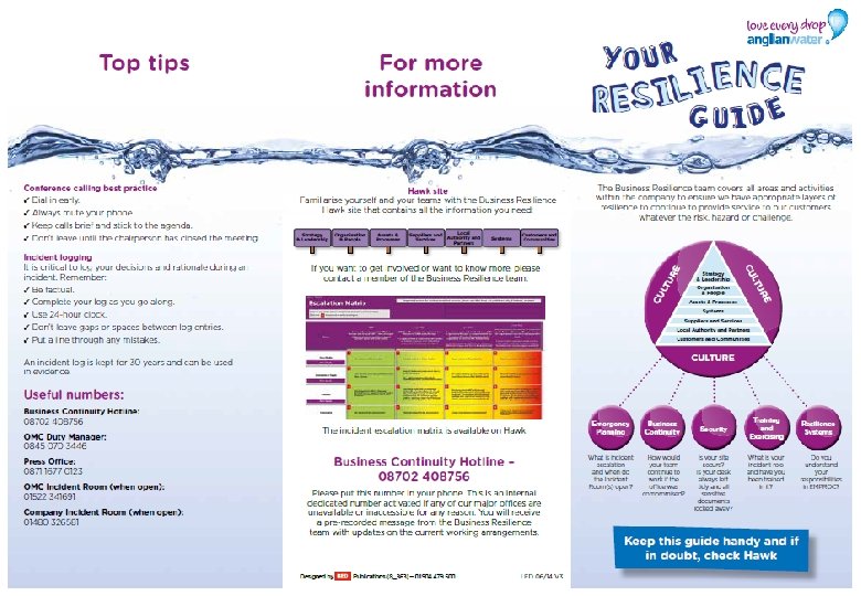 LT UR CU Strategy & Leadership Organisation & People Assets & Processes E UR LT CU E Anglian Water’s structure for organisational resilience Systems Suppliers & Services Local Authorities & Partners Customers & Communities CULTURE